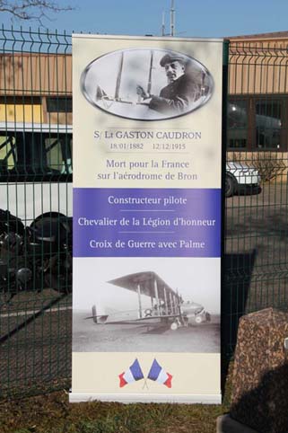 C’est vers la fin de l’année dernière qu’il faut chercher l’opération qui aura marquée 2015. En effet nous avons décidé de célébrer le centième anniversaire de la mort de Gaston Caudron sur l’aérodrome de BRON le 12 décembre 1915 à bord d’un Caudron R-4. Il était accompagné pour ce vol d’essai par MM. Jaumes et Desmaretz. L’avion s’est brisé en vol et a pris feu en percutant. Notre président à collecté des documents que nous avons complètés avec ceux puisés dans nos archives. Ce matériel a servi à confectionner des panneaux illustrés qui ont été affichés le jour de la manifestation. La célébration a eu lieu sur l’emplacement du monument à l’extrémité sud de l’aérodrome. Monument qu’il a fallu sérieusement rénover tant il était mal en point. Les porte-drapeaux étaient présents, les municipalités de Bron et St Priest étaient représentées (le monument se trouve sur la commune de St Priest), le Président Baillet prononça un discours détaillé sur la vie de Gaston Caudron puis la sono diffusa successivement la sonnerie « Aux morts » et « la Marseillaise ». Tout le monde se dirigea ensuite vers le Fort de Bron pour la visite de l’exposition et le vin d’honneur qui suivit.