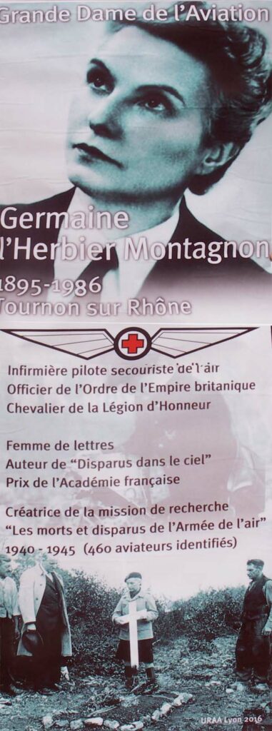 Mme L’Herbier-Montagnon est une IPSA (Infirmière parachutiste ou/et pilote et secouriste de l’air). Elle se distingue pendant la guerre et après celle-ci en recherchant les corps des aviateurs Français portés disparus pendant les opérations. Elle retrouvera ainsi près de 500 corps d’aviateurs et leur donnera la sépulture décente qu’ils méritent. Elle est décédée à Tournon où la municipalité a accordé le statut de « perpétuelle » à sa tombe